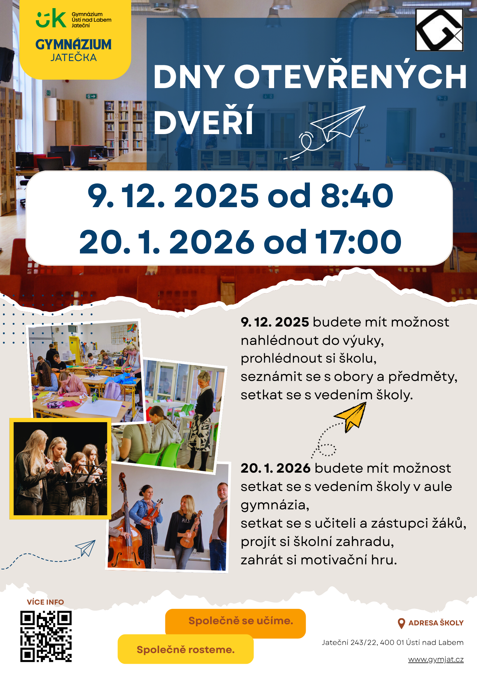 Dny otevřených dveří na našem gymnáziu proběhnou v prosinci a v lednu. Program ještě vyladíme, proto nás sledujte na sociálních sítích, ať vám nic neunikne. A neváhejte, přijďte!